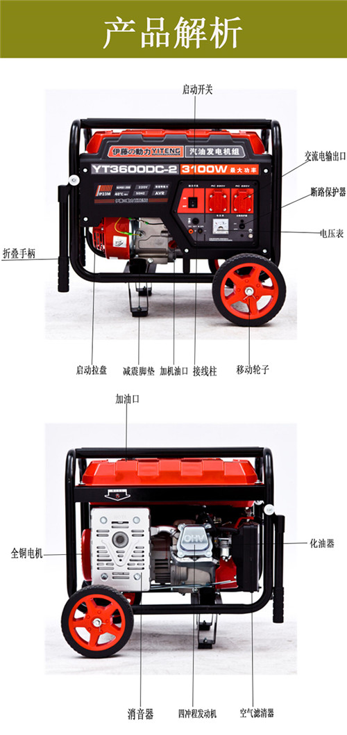 汽油发电机通常由定子、转子、端盖及轴承等部件构成。发动机是将化学能转化为机械能的机器,它的转化过程实际上就是工作循环的过程,简单来说就是是通过燃烧气缸内的燃料,产生动能,驱动发动机气缸内的活塞往复的运动,由此带动连在活塞上的连杆和与连杆相连的曲柄,围绕曲轴中心作往复的圆周运动,而输出动力的。